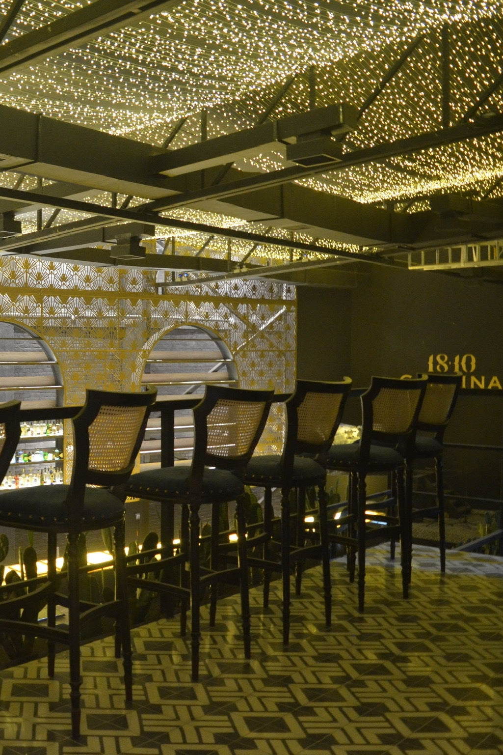 Bajo un dosel de ramas doradas que se expanden como raíces etéreas, este bar es un santuario de lujo y misterio. La barra de ónix iluminada resguarda secretos entre sus vetas traslúcidas, mientras el número "1810" evoca un tiempo suspendido entre historia y modernidad. Sobre él, un techo de patrones dorados y luces sutiles se alza como un firmamento de opulencia.
