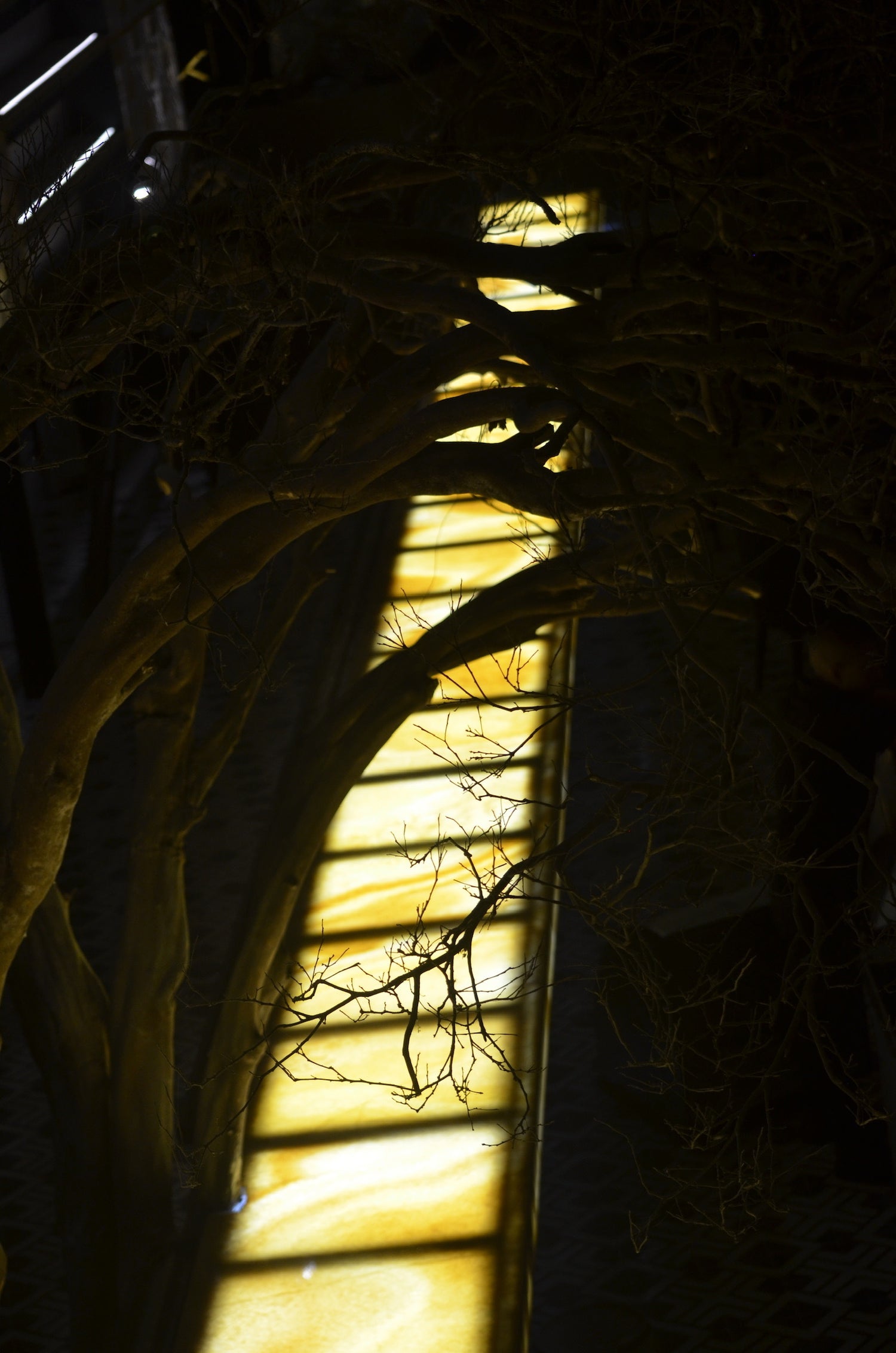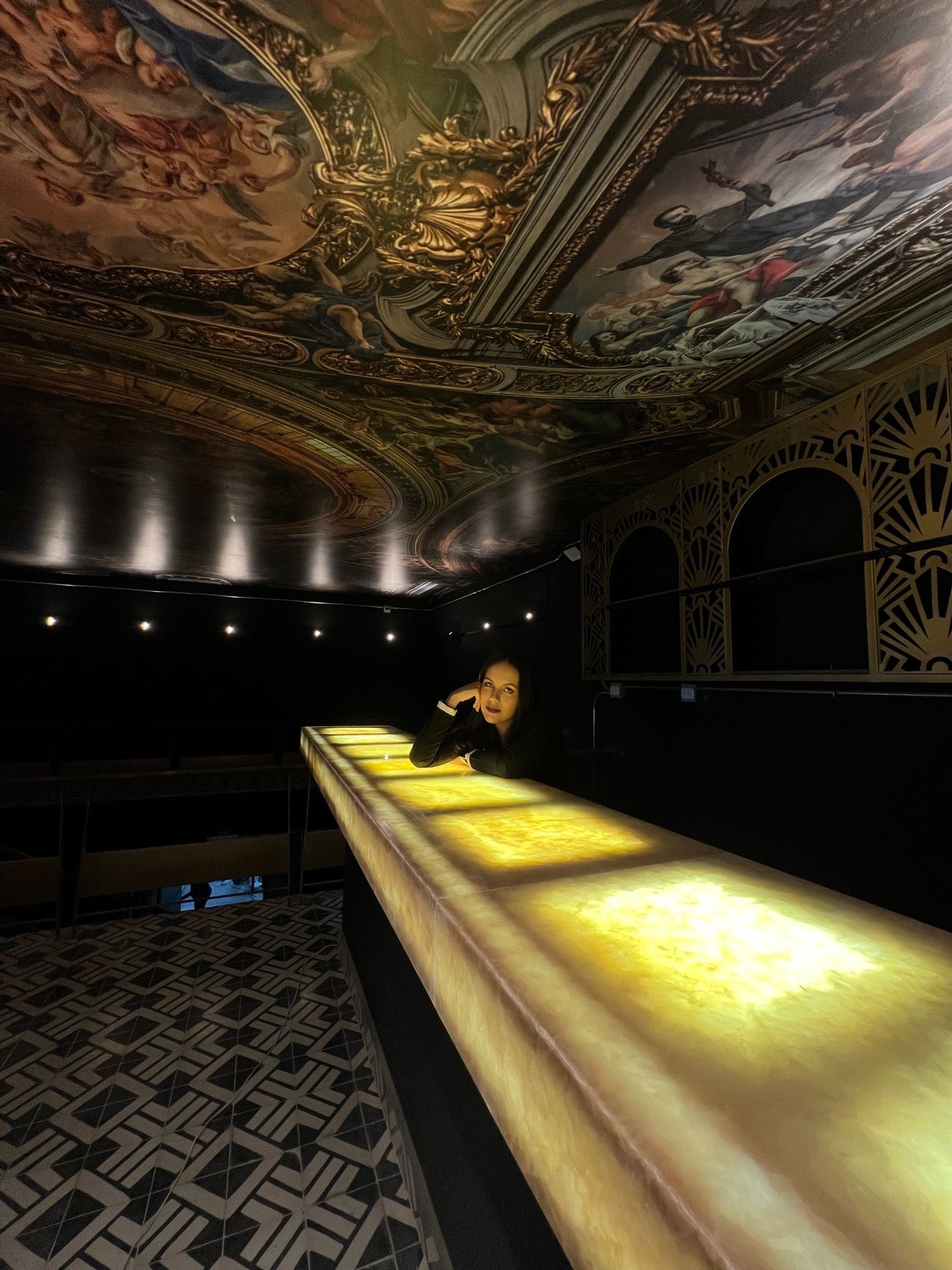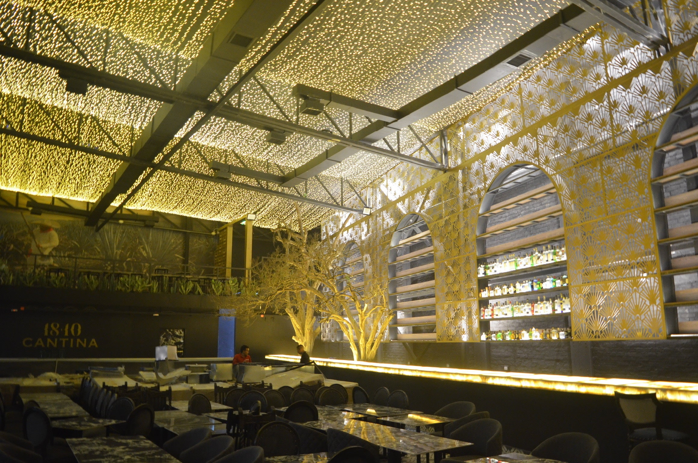 (EN) Beneath a canopy of golden branches that stretch like ethereal roots, this bar stands as a sanctuary of luxury and mystery. The illuminated onyx counter holds secrets within its translucent veins, while the number "1810" evokes a time suspended between history and modernity. Above it, a ceiling of golden patterns and subtle lights rises like a firmament of opulence.