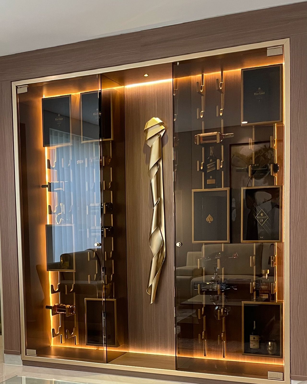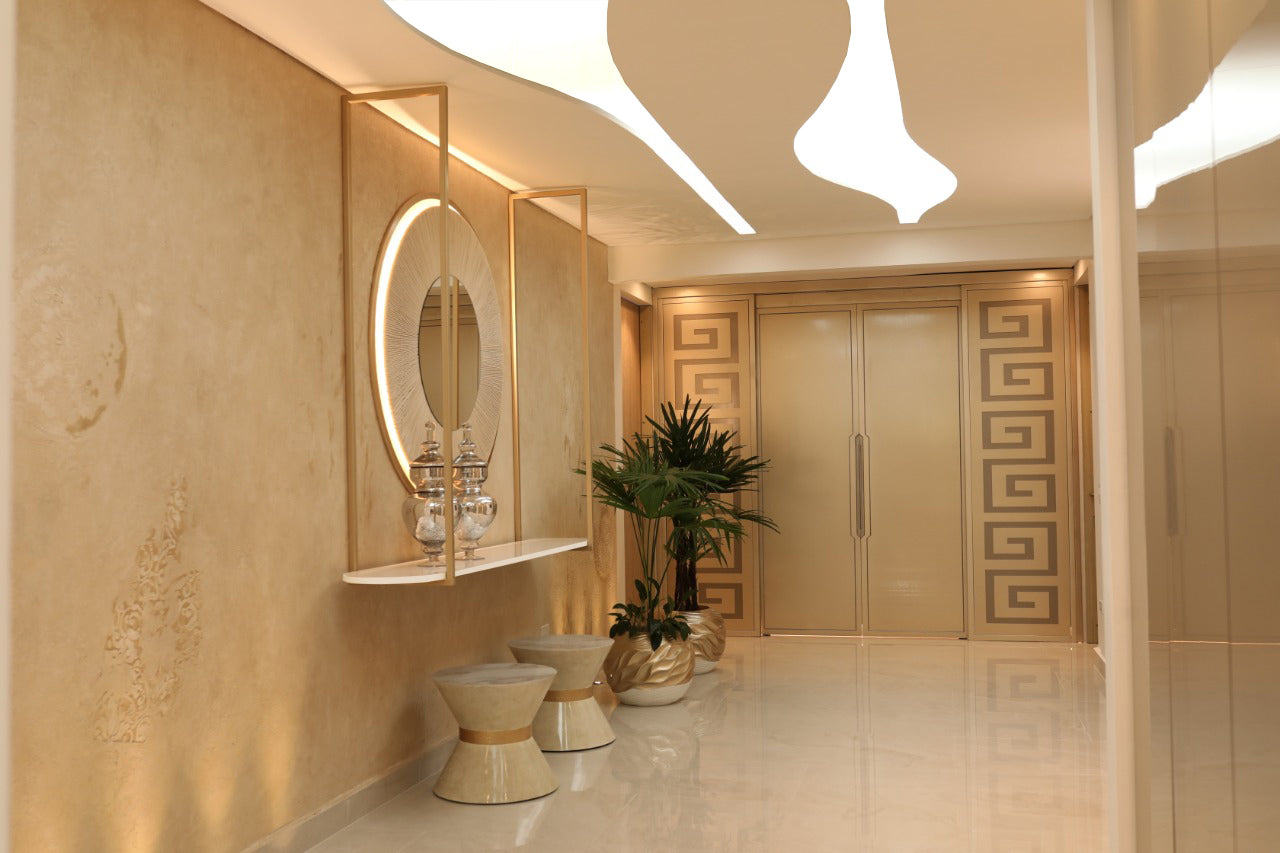 Gold details frame every element with sophistication, from the backlit mirror to the organically designed lamps that soften the lighting. The combination of textures and finishes, along with the presence of plants, balances luxury with a natural feel, making this space an imposing and harmonious entrance.