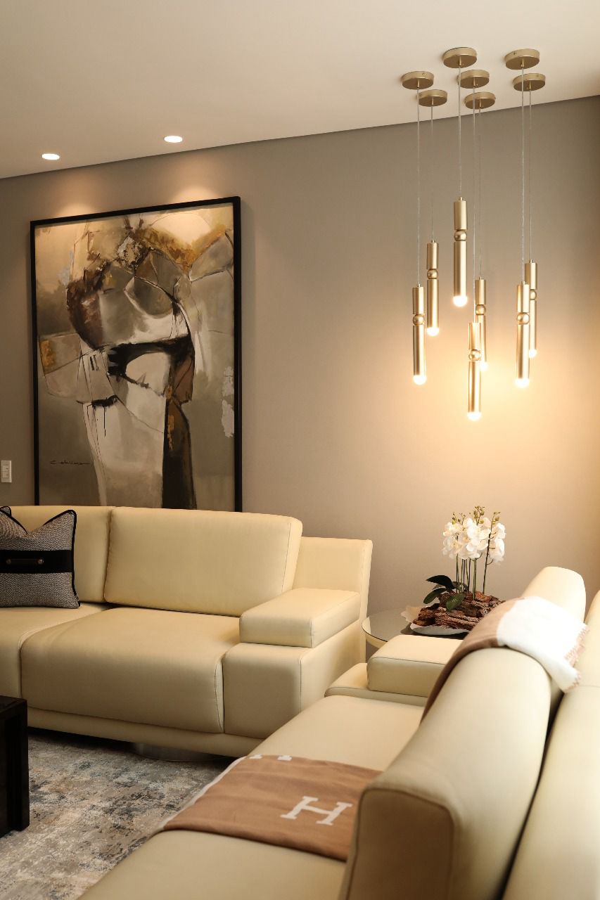 Cada elemento evoca sofisticación: el espejo, enmarcado en líneas doradas, multiplica la luz con suavidad envolvente; las lámparas flotan como esculturas celestiales, moldeando la atmósfera con un fulgor difuso. Entre el verde vibrante de las plantas y la textura noble de los metales, este espacio no es solo una entrada, sino un umbral hacia un universo donde la elegancia y la calidez conviven en armonía perfecta.