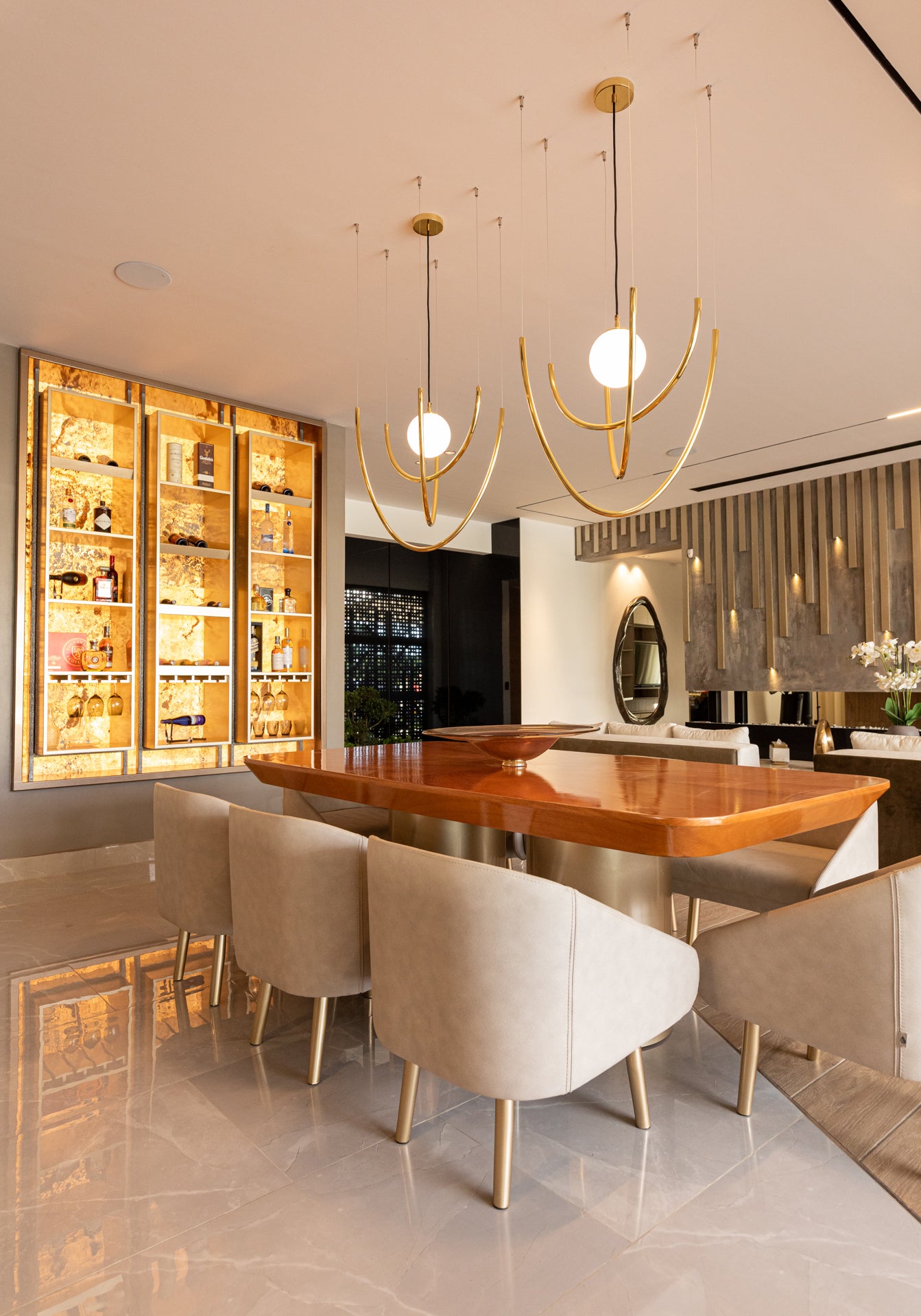 The furniture selection highlights the intention of creating an elegant yet comfortable space, where each piece complements the overall aesthetic without losing functionality. The materiality, with finishes in stone, wood and velvety textiles, reinforces the visual richness of the environment, achieving a balance between luxury and serenity.