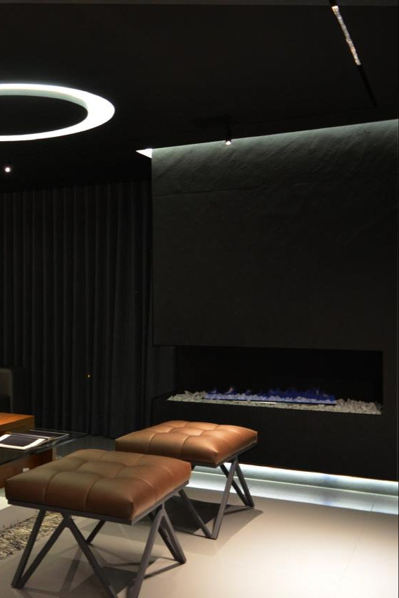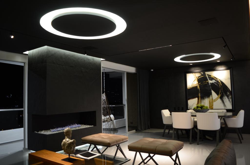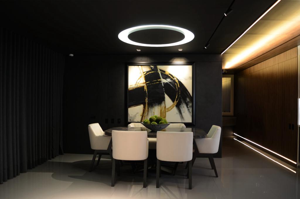Recessed ceiling lights, arranged in luminous lines and rings, create an enveloping atmosphere, highlighting the depth of the design. A minimalist fireplace, clad in a dark texture, adds warmth and character. In the dining room, dark wood and light chairs create visual balance, while a centerpiece of natural spheres introduces a subtle organic gesture to the environment.