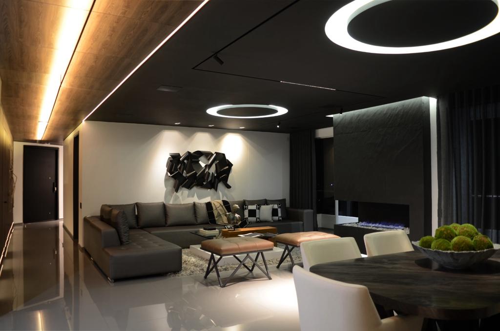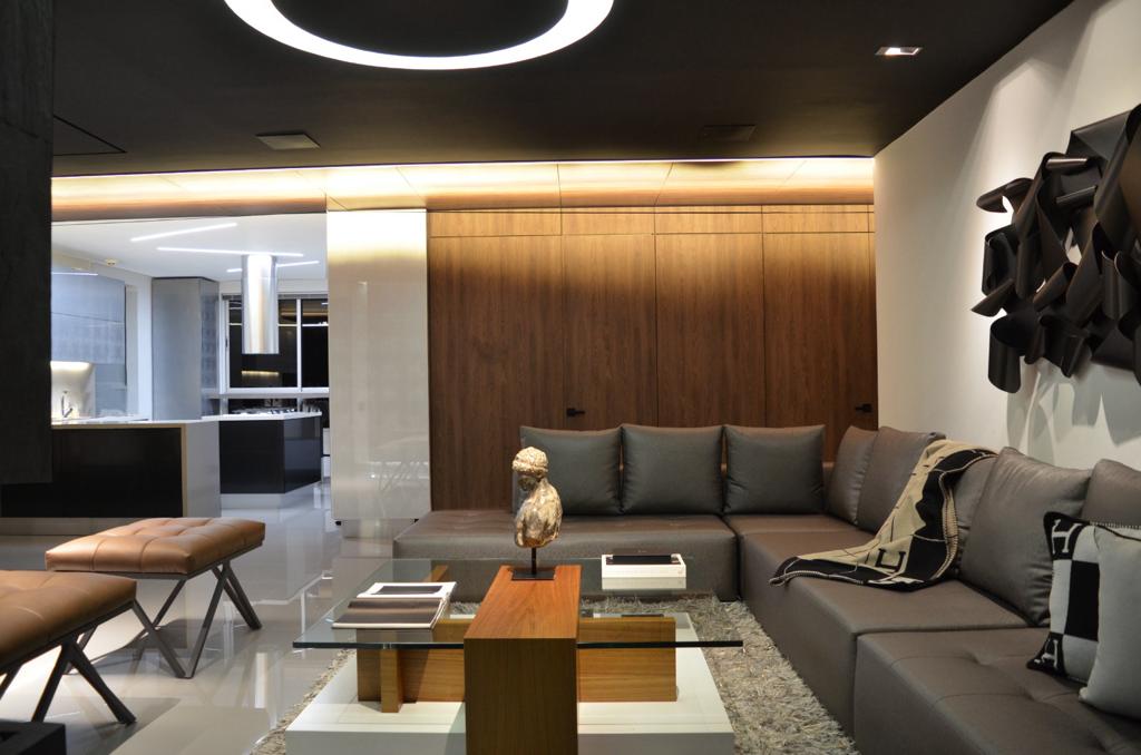 (EN)The space combines elegance and modernity through a palette of dark tones and sophisticated contrasts. A generous set of deep gray seating becomes the centerpiece, accompanied by leather benches and a coffee table that balances functionality and aesthetics.