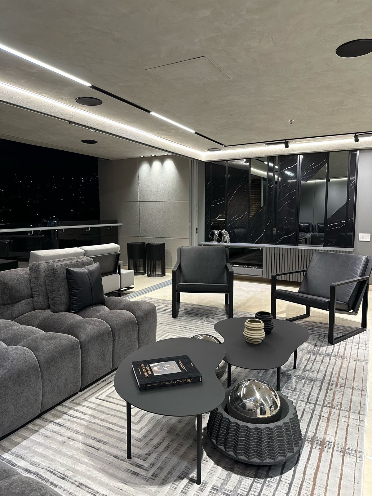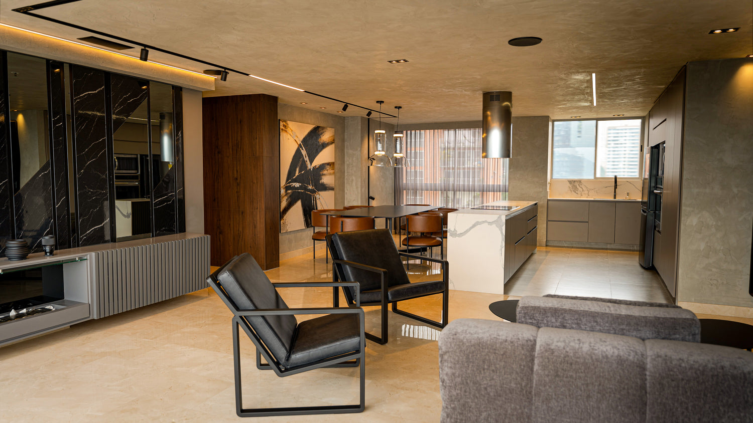 El mobiliario en tonalidades oscuras se fusiona con el paisaje urbano de fondo, el cual; enmarcado por un cielo raso con acabado en microcemento busca generar continuidad, adaptando la estética industrial con la calidez de la iluminación del riel magnético, el cuero cámel y los paneles en madera que aseguran la pulcritud del pasillo hacia los dormitorios.